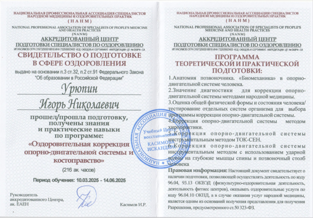 Оздоровительная коррекция опорно-двигательной системы и костоправство. Ульяновск. 2025 г.